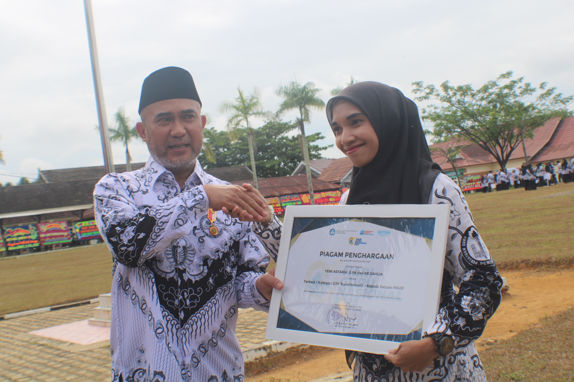 Pada kesempatan tersebut, Bupati Bungo juga menyerahkan penghargaan kepada sejumlah guru dan siswa berprestasi sebagai bentuk apresiasi atas dedikasi dan pencapaian yang berhasil diraih.