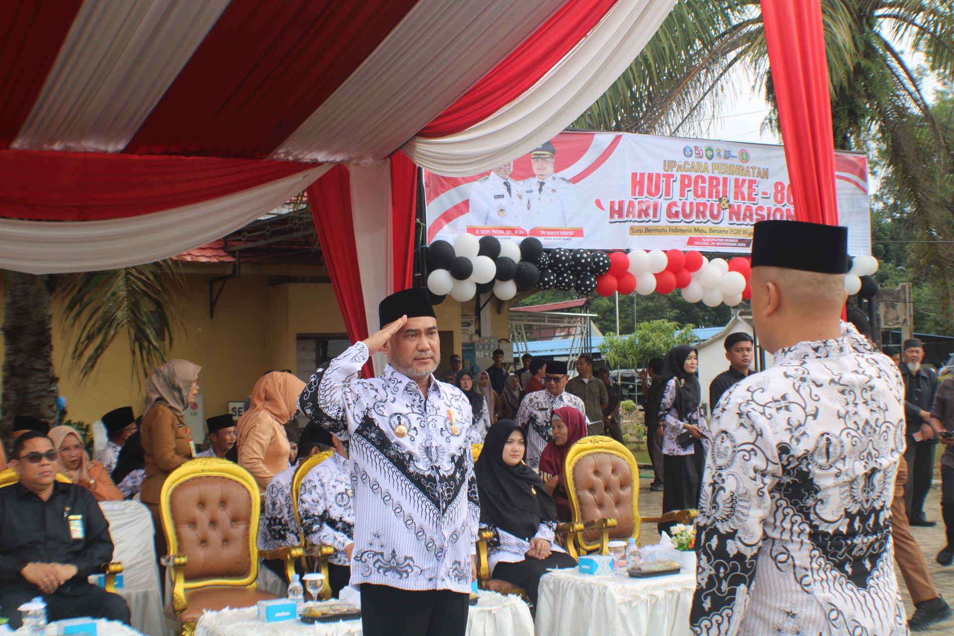 Bungokab.go.id, Muara Bungo – Pemerintah Kabupaten Bungo menggelar Upacara Peringatan Hari Guru Nasional (HGN) dan Hari Ulang Tahun (HUT) ke-80 Persatuan Guru Republik Indonesia (PGRI) di lapangan upacara Kantor Bupati Bungo, Selasa (25/11/2025).