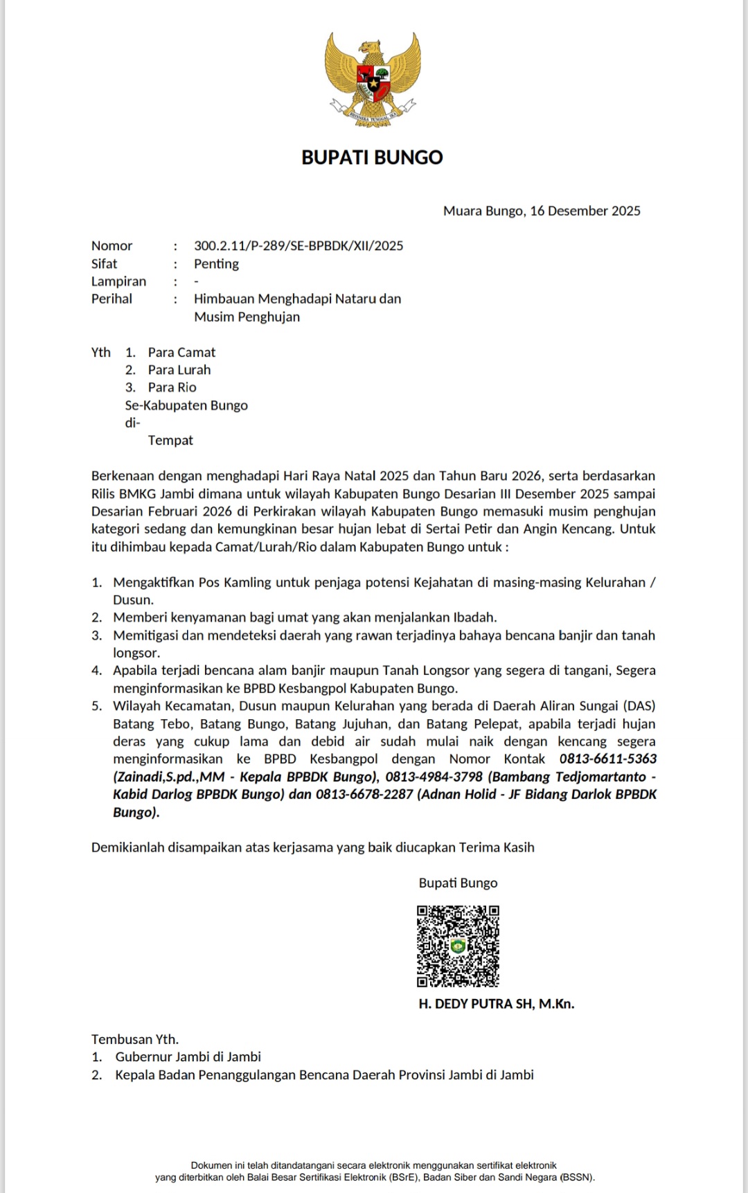 Bungokab.go.id, Bungo – Bupati Bungo, H. Dedy Putra, SH., M.Kn., mengeluarkan Surat Imbauan Nomor 300.2.11/P-289/SE-BPBDK/XII/2025 tertanggal 16 Desember 2025 kepada seluruh Camat, Lurah, dan Rio se-Kabupaten Bungo terkait kesiapsiagaan menghadapi Hari Raya Natal 2025, Tahun Baru 2026, serta musim penghujan.